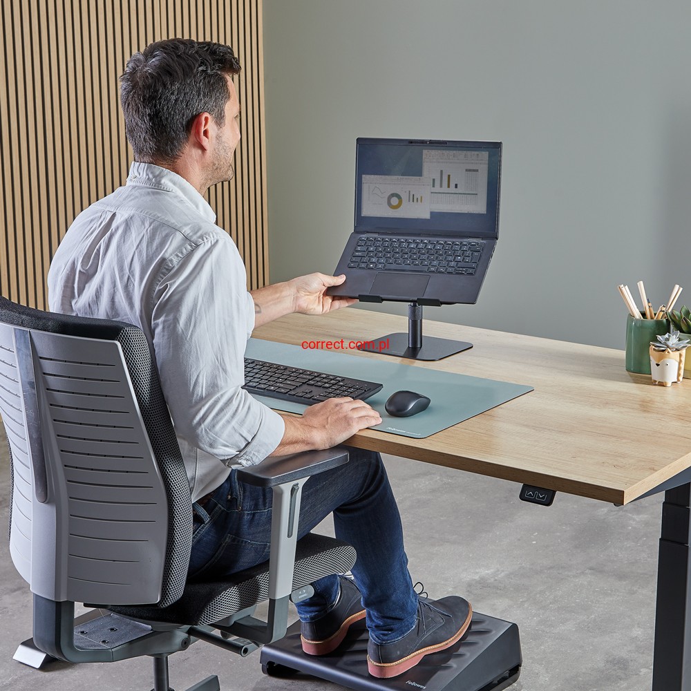 Podstawka pod laptopa Alumia™ to nowoczesne i ergonomiczne rozwiązanie, które pomaga ustawić ekran na komfortowej wysokości. Uniesienie laptopa do optymalnej pozycji redukuje napięcie oczu, szyi i ramion, zwiększając wygodę pracy podczas długiego dnia przy biurku:
