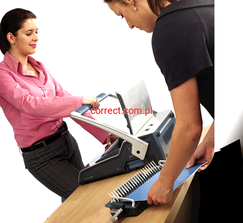 - System dziurkowania pionowego umożliwia niezależne dziurkowanie i nakładanie dokumentów na grzbiet, ułatwia i przyspiesza czas oprawy