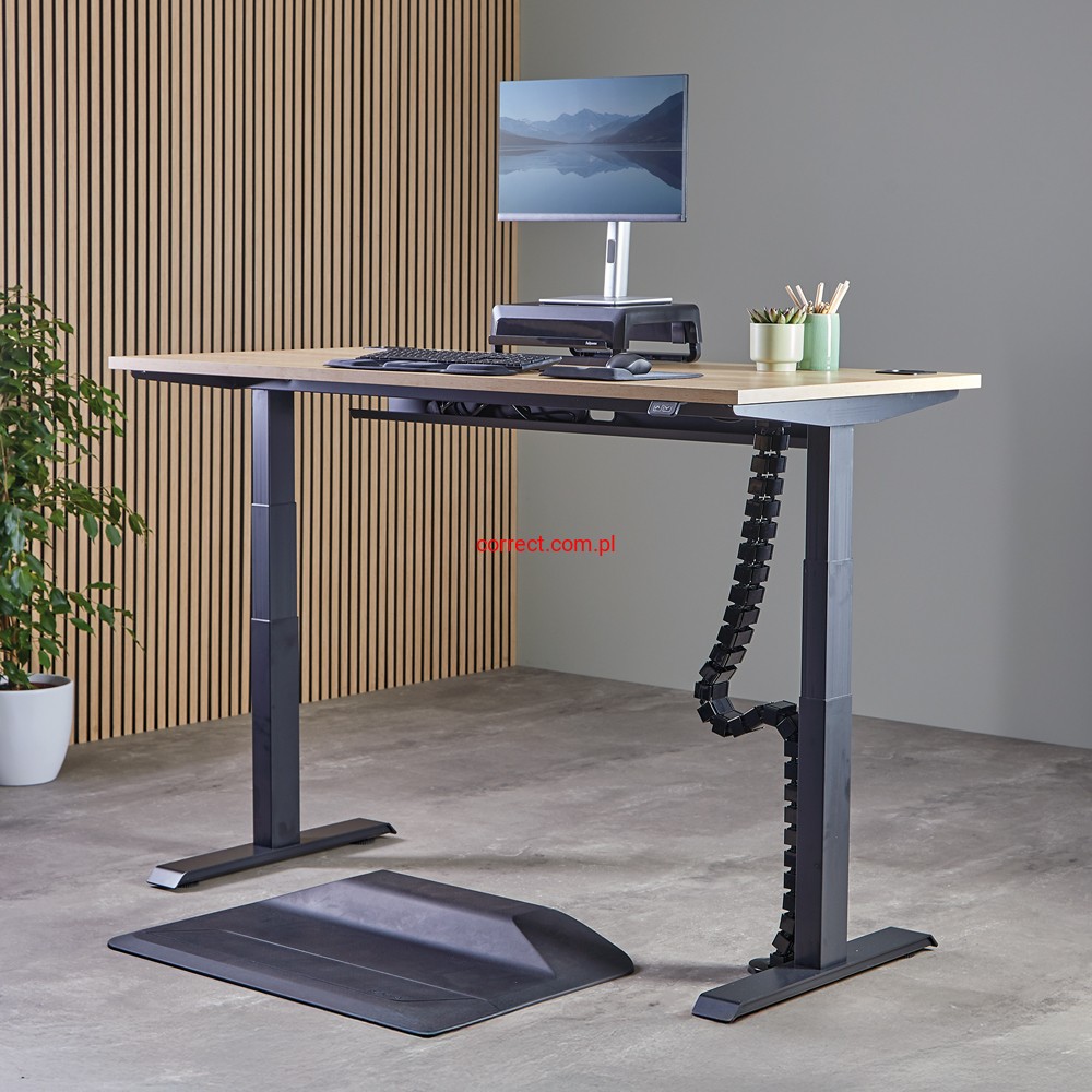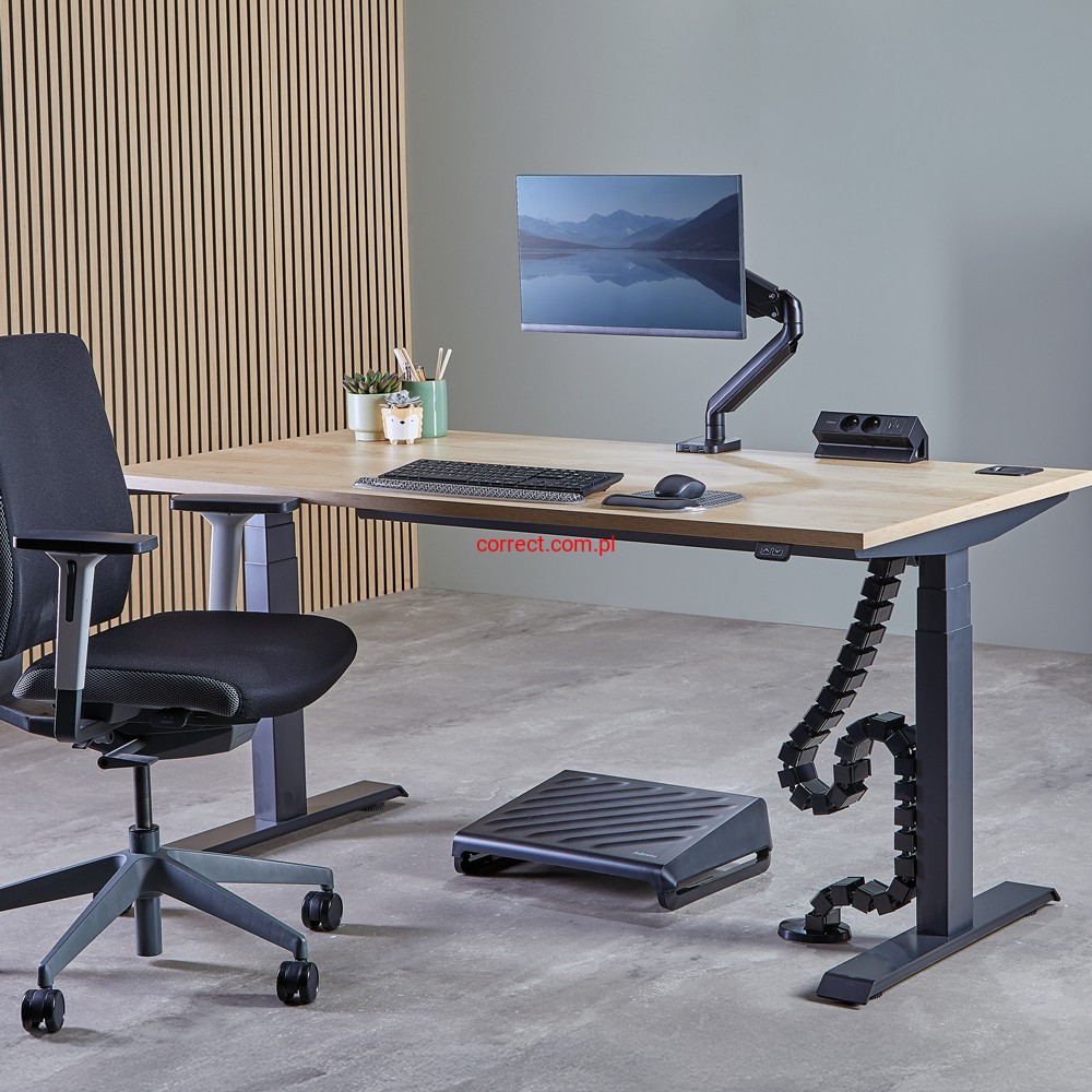 - Elastyczny grzbiet dopasowuje się do biurek z regulacją wysokości (do 130 cm), płynnie dostosowując się do zmian wysokości biurka.