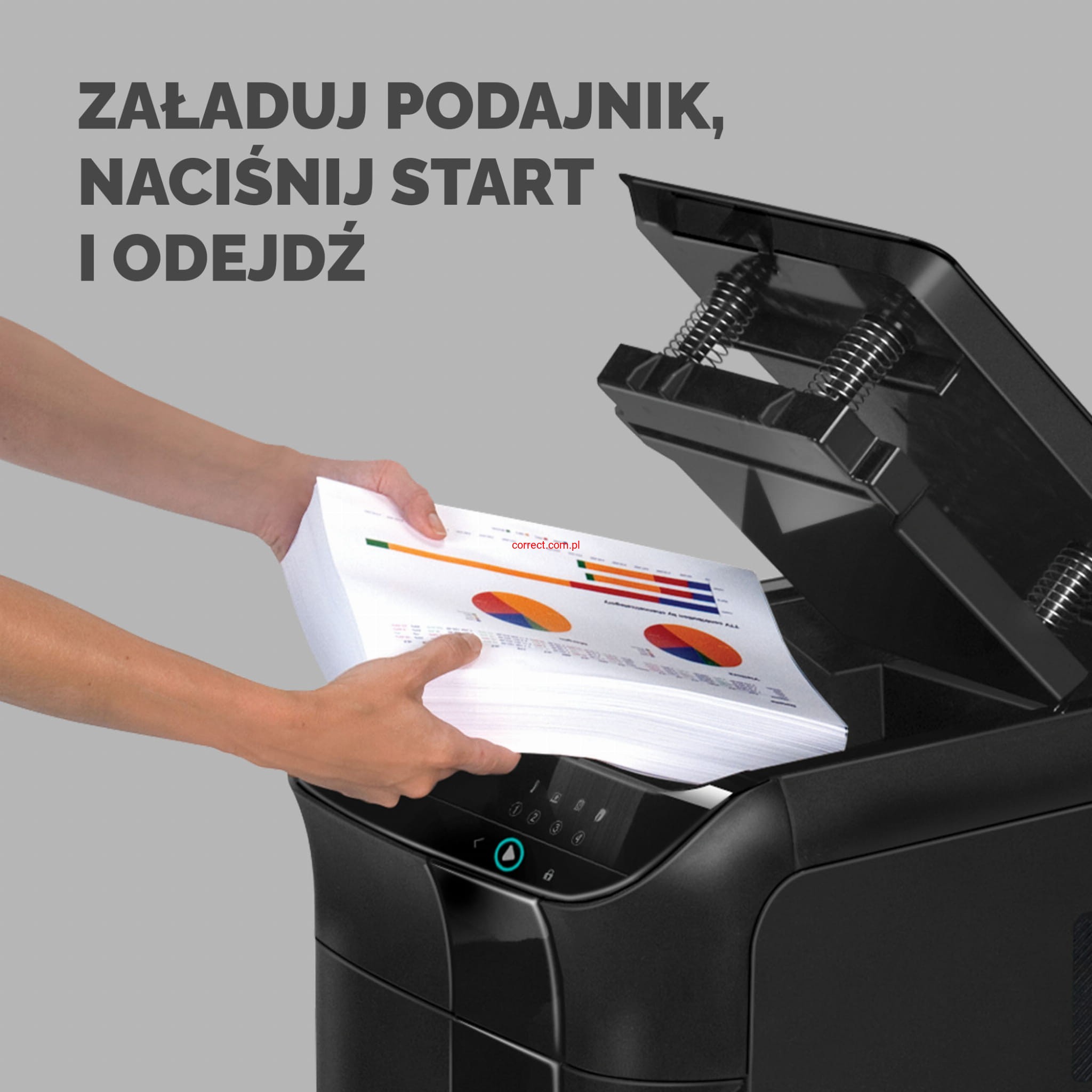 - Prosta w obsłudze – wystarczy włożyć dokumenty lub nośniki do podajnika, włączyć przycisk niszczenia i można wrócić do swoich obowiązków – resztę wykona niszczarka za Ciebie