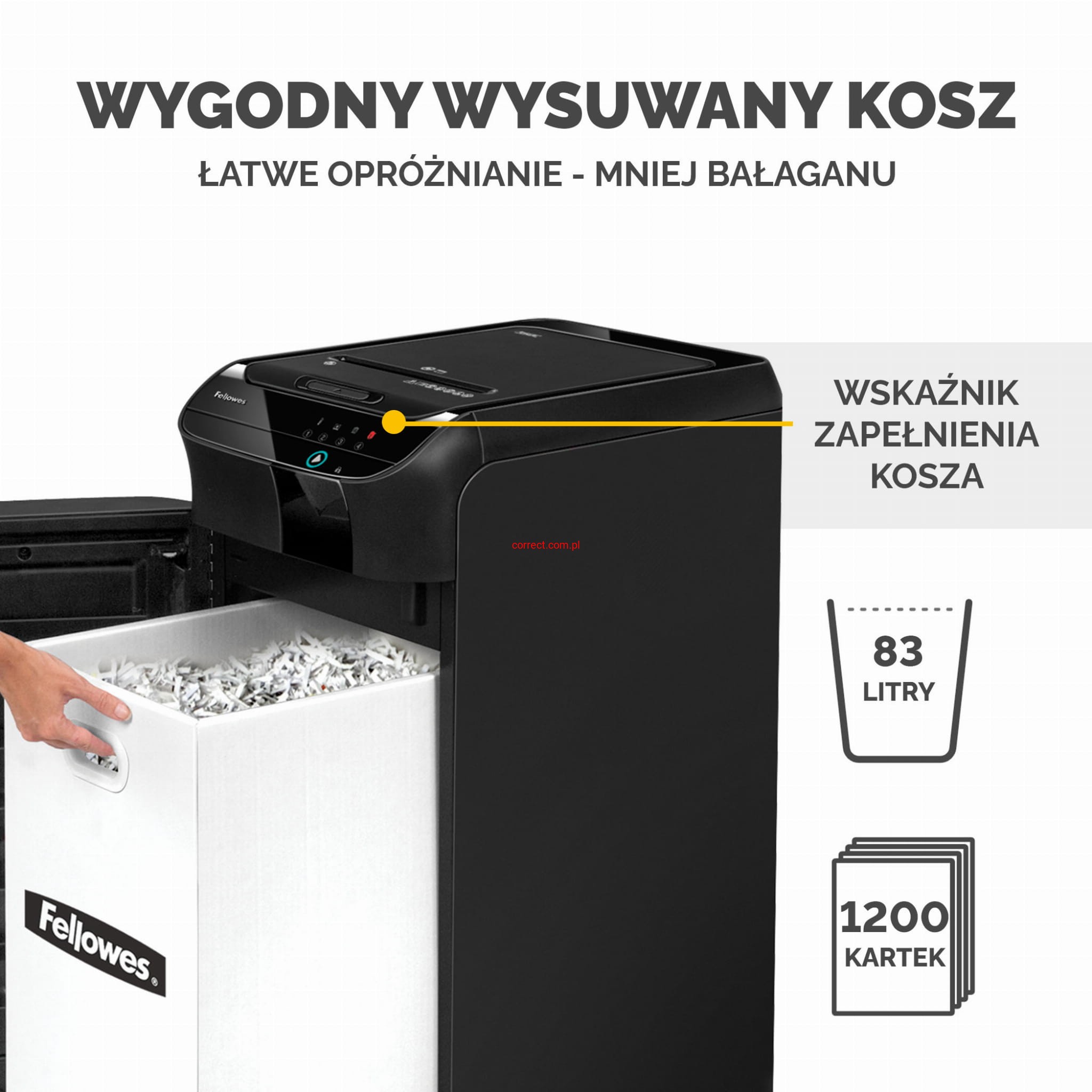 - Bardzo duża wydajność – niszczy automatycznie do 550 kartek w zaledwie 13 minut