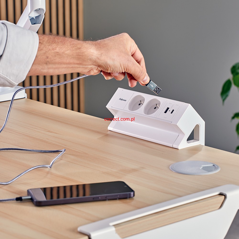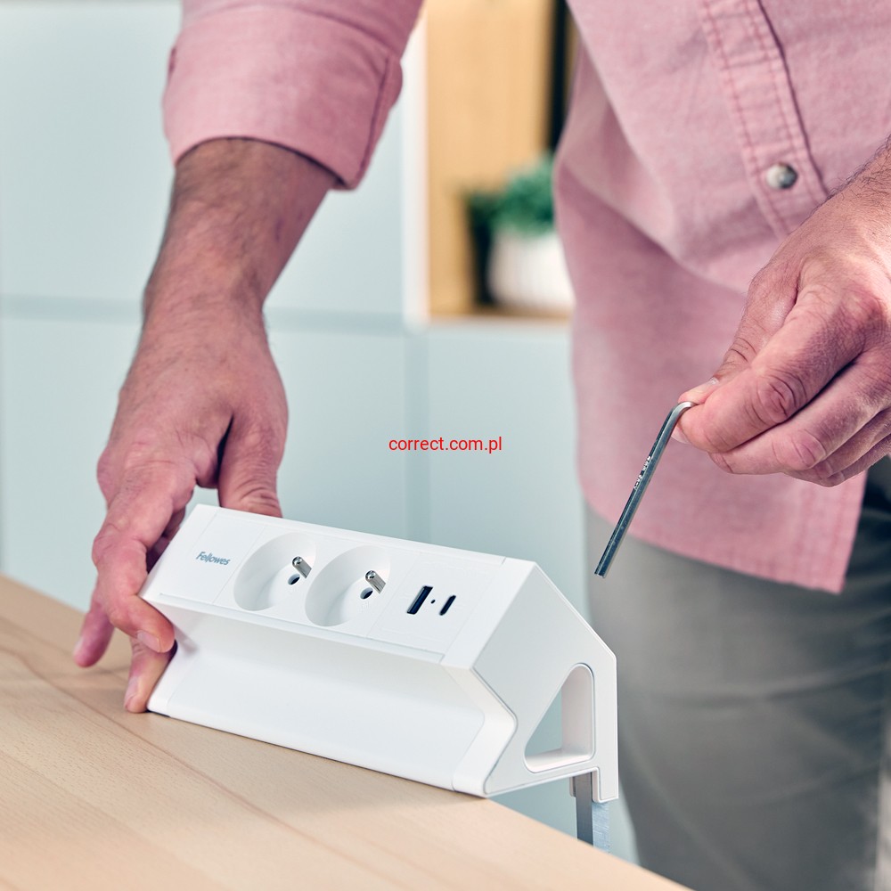 Power Desk® 2 to praktyczny moduł zasilający do biurka, który umożliwia wygodne ładowanie urządzeń i pomaga utrzymać porządek na stanowisku pracy. Dzięki montażowi na zacisk urządzenie nie wymaga wiercenia ani ingerencji w blat, a jednocześnie zapewnia łatwy dostęp do zasilania dokładnie tam, gdzie jest potrzebne. Power Desk® 2 doskonale sprawdza się zarówno w domowym gabinecie, jak i w nowoczesnym biurze, łącząc funkcjonalność z estetycznym, minimalistycznym wyglądem: