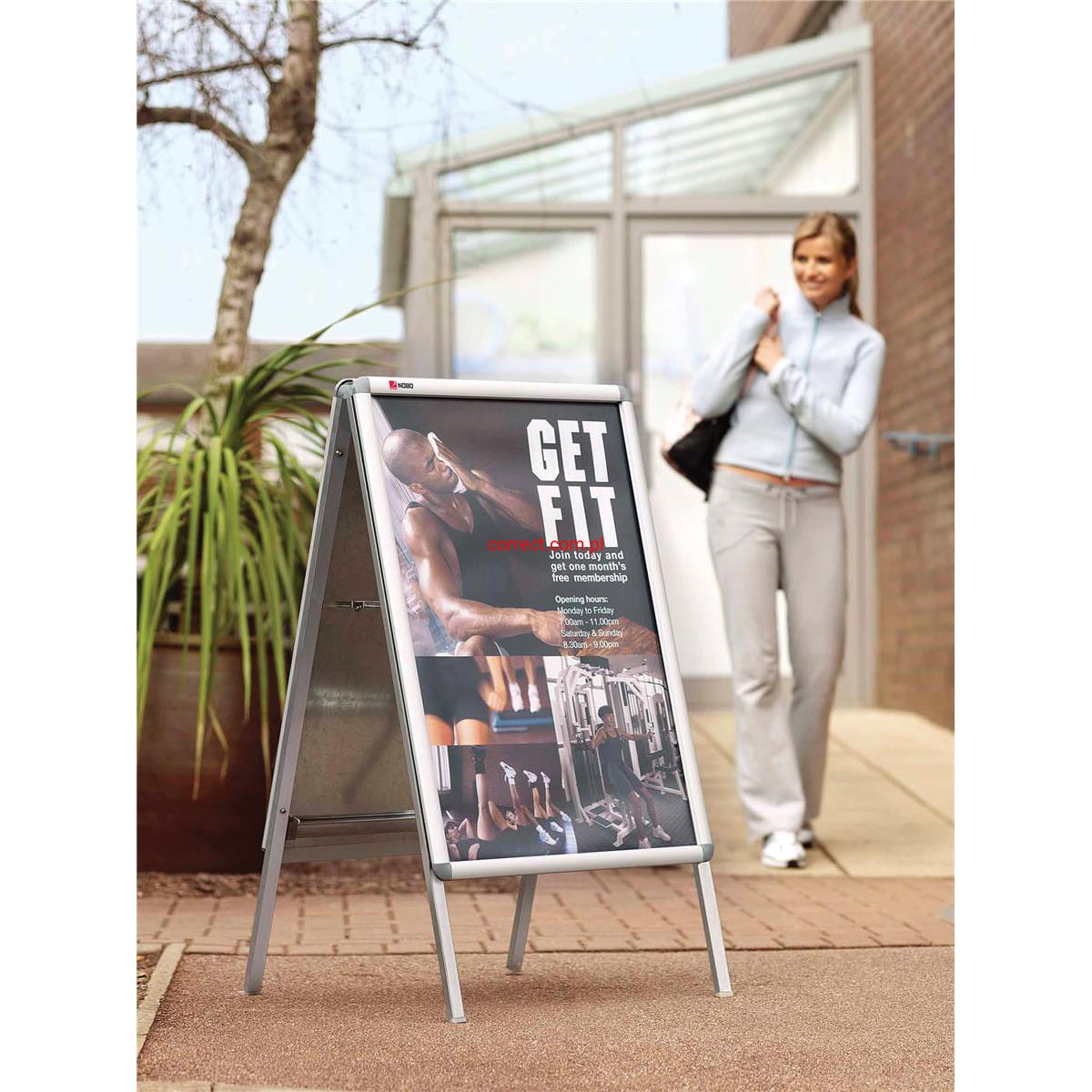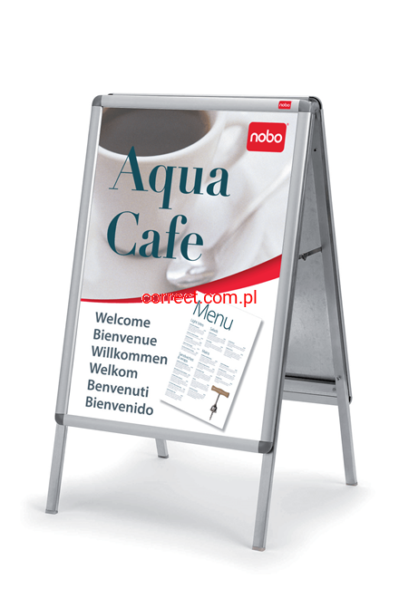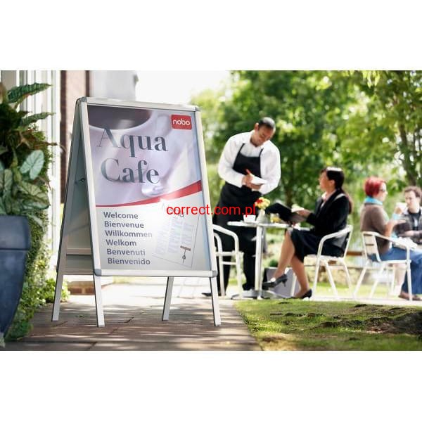 Odporne na warunki atmosferyczne zatrzaskowe stojaki Nobo są łatwe w użyciu i umożliwiają idealną prezentację plakatów i innych informacji zarówno wewnątrz budynków, jak i na zewnątrz.